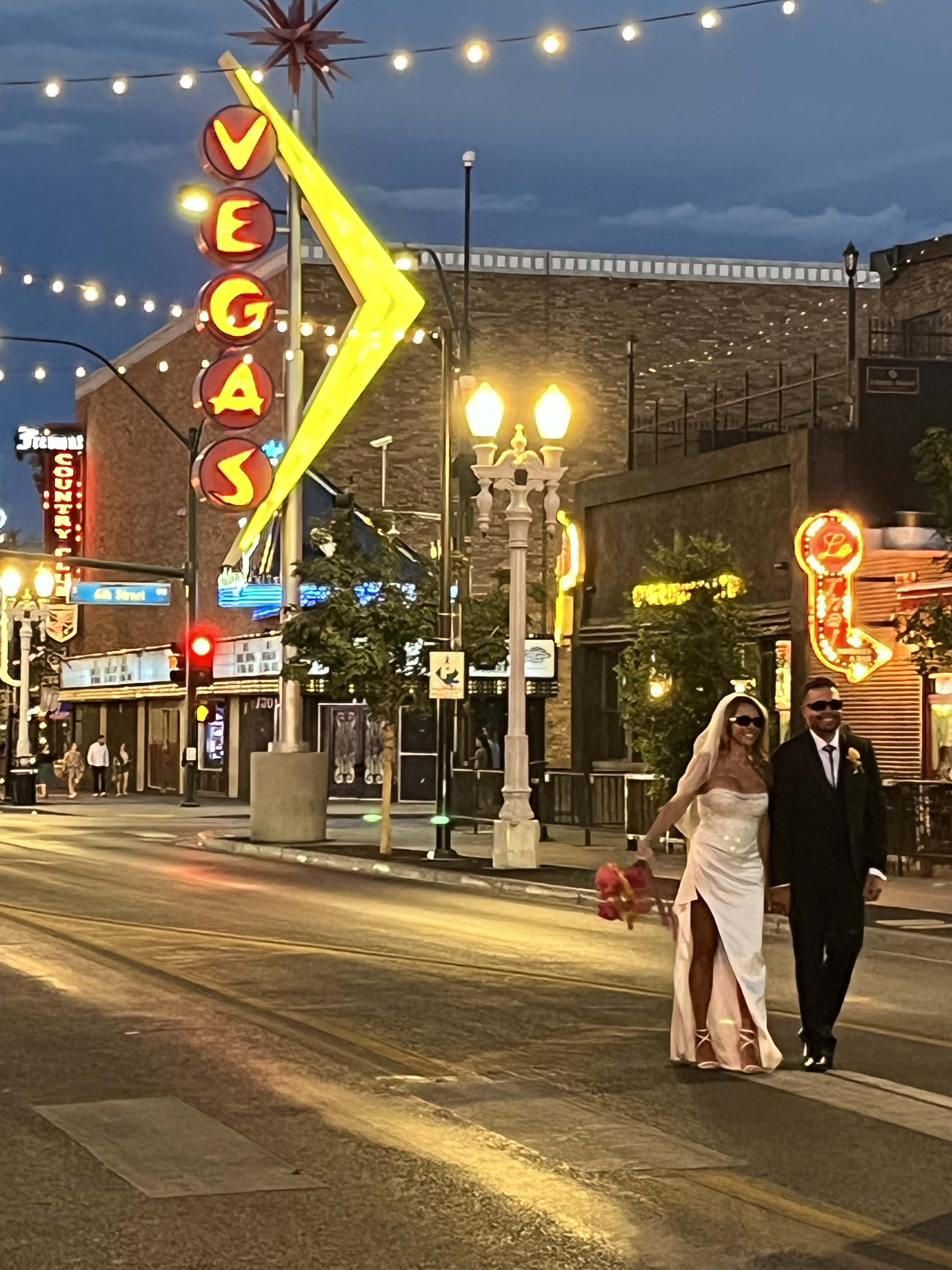 The crowd thinned out on the Fremont East side of the street. So did the noise and the flashing lights. It was there though where we saw our first newly married-in-Vegas couples celebrating – where they were getting married, we don’t know – followed around by a hired photographer.