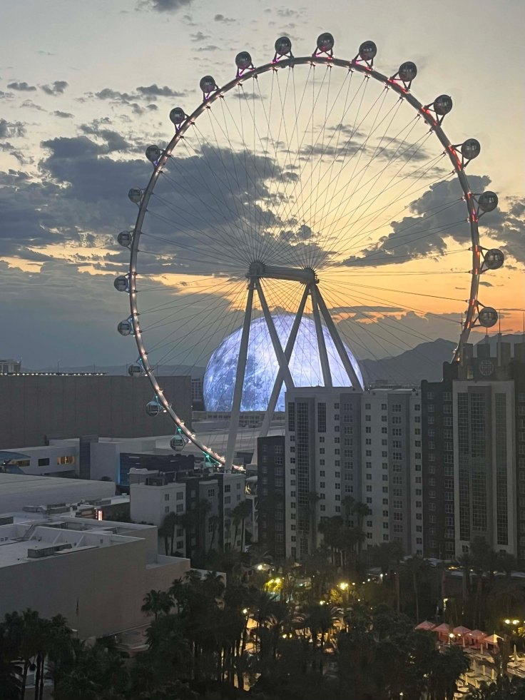 The description of our hotel room (a number so long I was afraid I’d forget it) was two queen size beds with a view of “attractions.” The attractions were the hotel grounds filled with palm trees, the High Roller ferris wheel and the Sphere. When we went to bed, I thought about closing the curtains and then I decided not to – the windows are one-way visibility – and woke up to the Sphere on a backdrop of a deep orange sunrise.