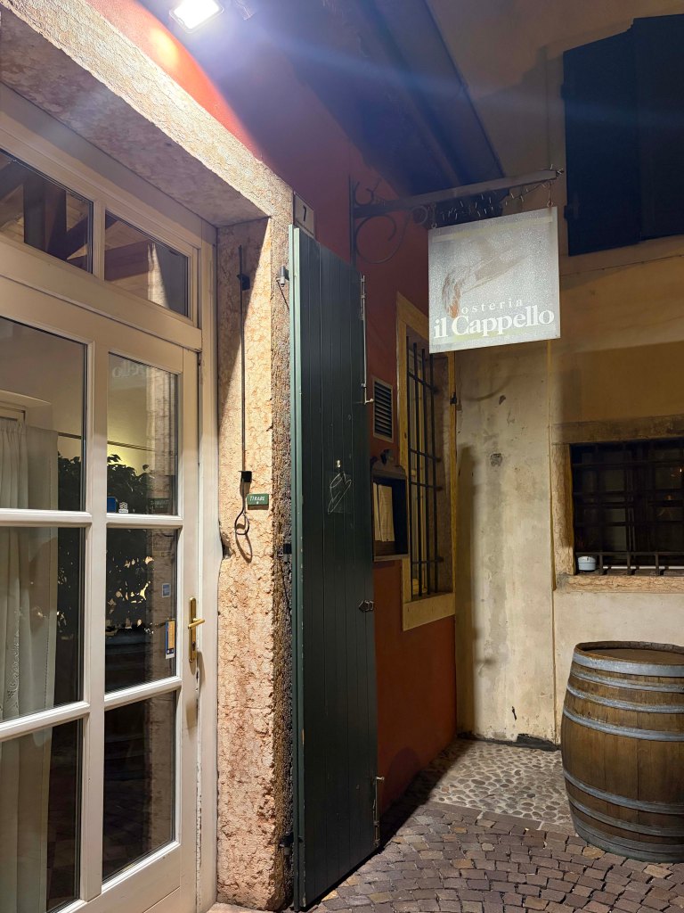I walked back through the passageway and around until I found myself on the other side of the building I had just tried to enter. A glass-paned door with a sign over the top, Osteria Il Capello.