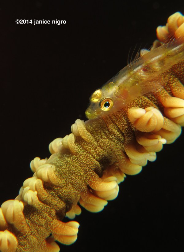 goby on a whip coral that looks as if it is gold plated. even the whip coral appears to be dusted with gold!